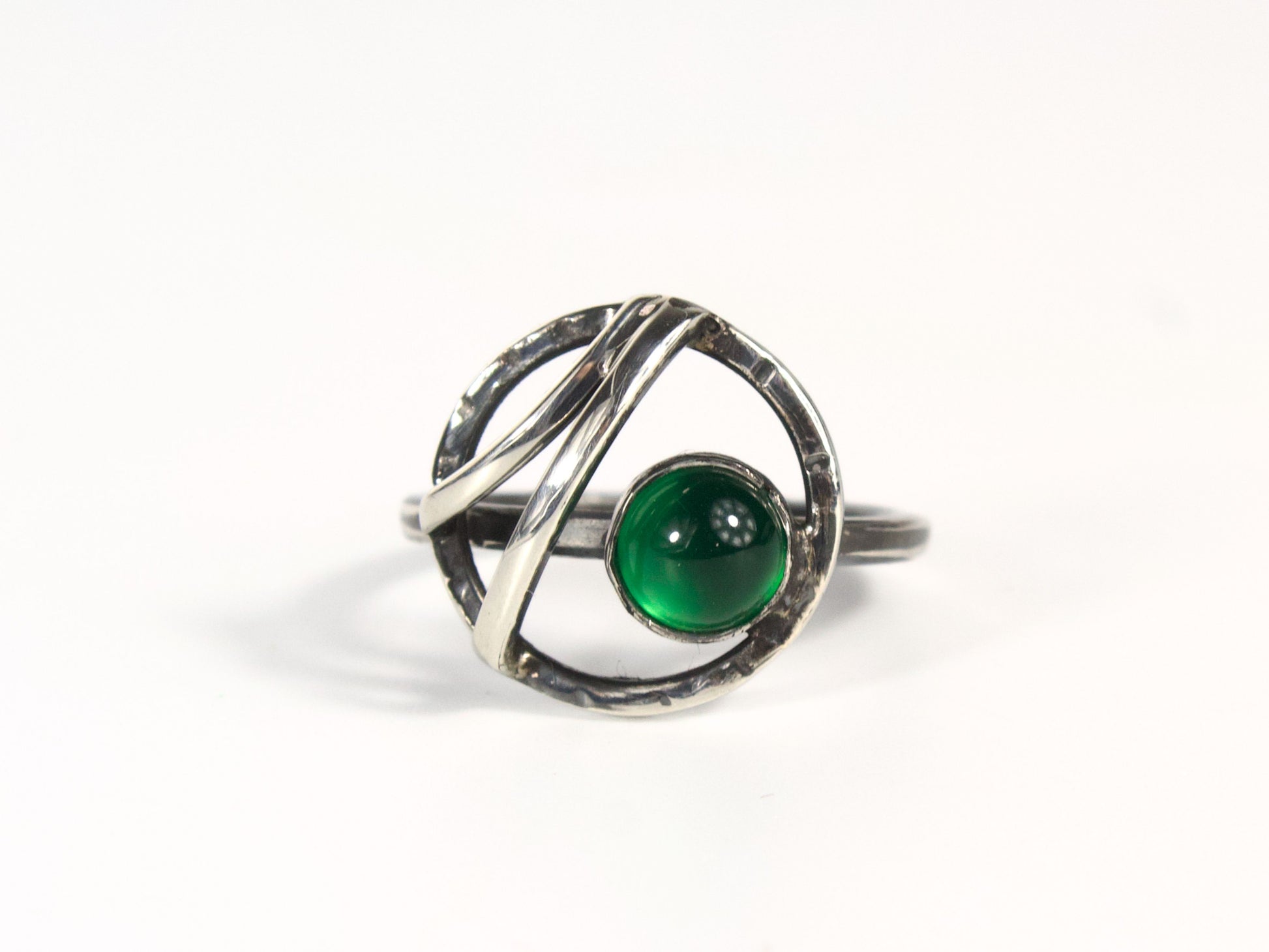 Für diesen Silberring habe ich grünen Achat (6 mm) gewählt. Ausgewählt aufgrund seiner Fähigkeit, Licht einzufangen, ist es ein sehr leuchtender und opalisierender Stein, der mit seiner intensiven grünen Farbe das schlagende Herz dieser Umlaufbahn darstellt.