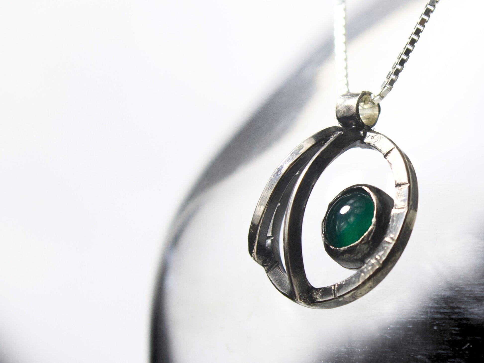 Ho creato questa collana immaginando un'architettura in movimento, dove il tempo e lo spazio si fondono. Al centro, un'Agata verde dal taglio cabochon sprigiona la sua energia calda e equilibrata.