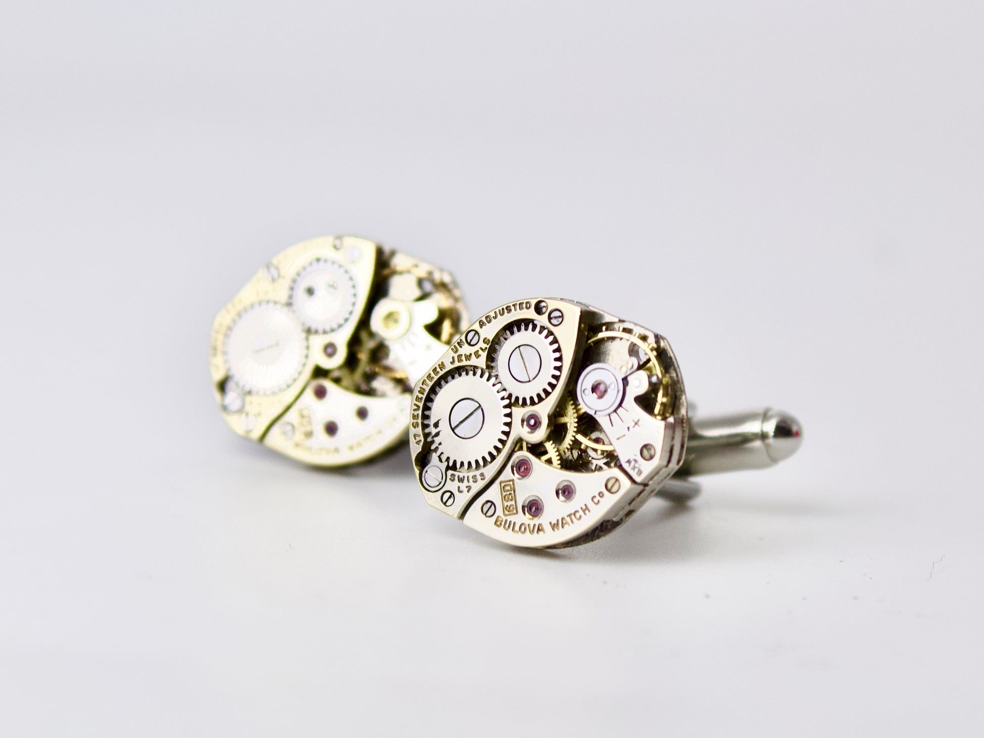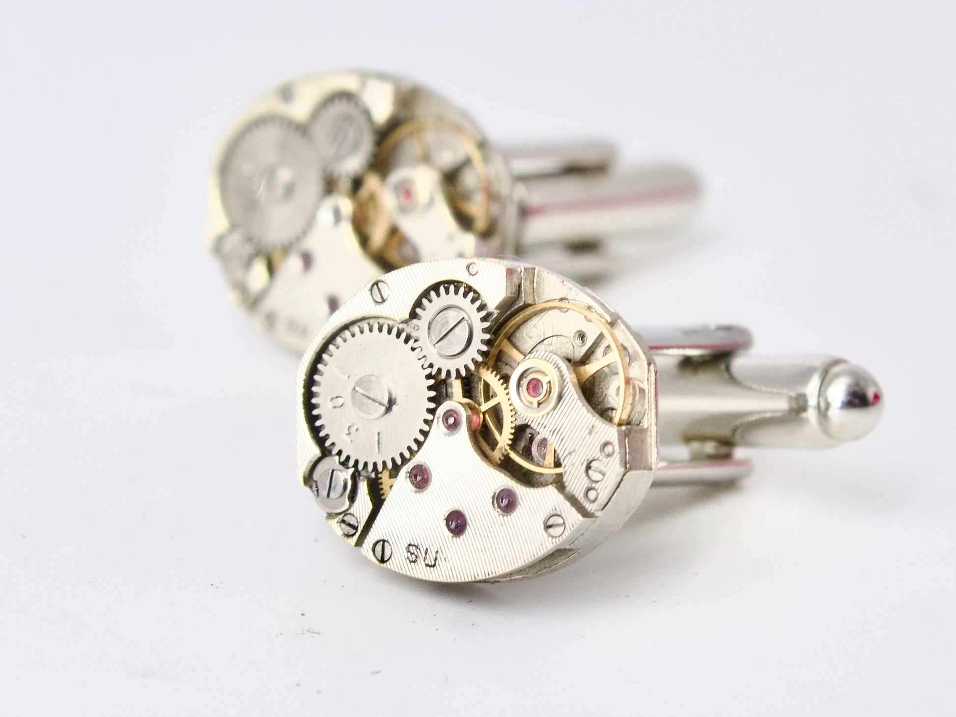 Questi gemelli da uomo artigianali sono realizzati a mano recuperando autentici meccanismi di orologi d'epoca.I movimenti interni degli orologi sono stati attentamente elaborati e saldati alle basi. Il meccanismo a vista e i rubini dell'orologio donano un tocco di luce in più, creando un effetto luminoso. I gemelli sono di misura standard e la clip mobile ne rende l'utilizzo semplice.