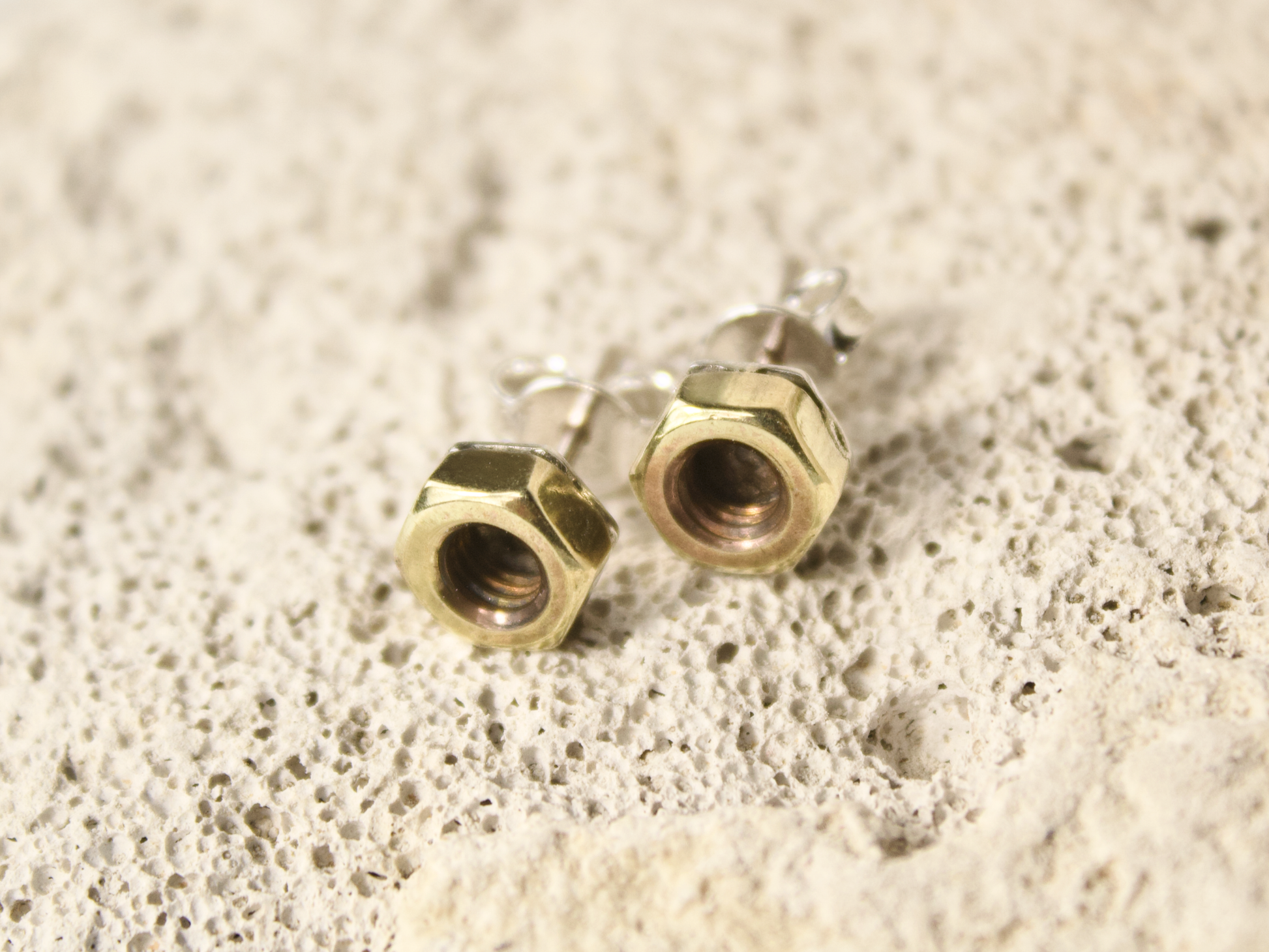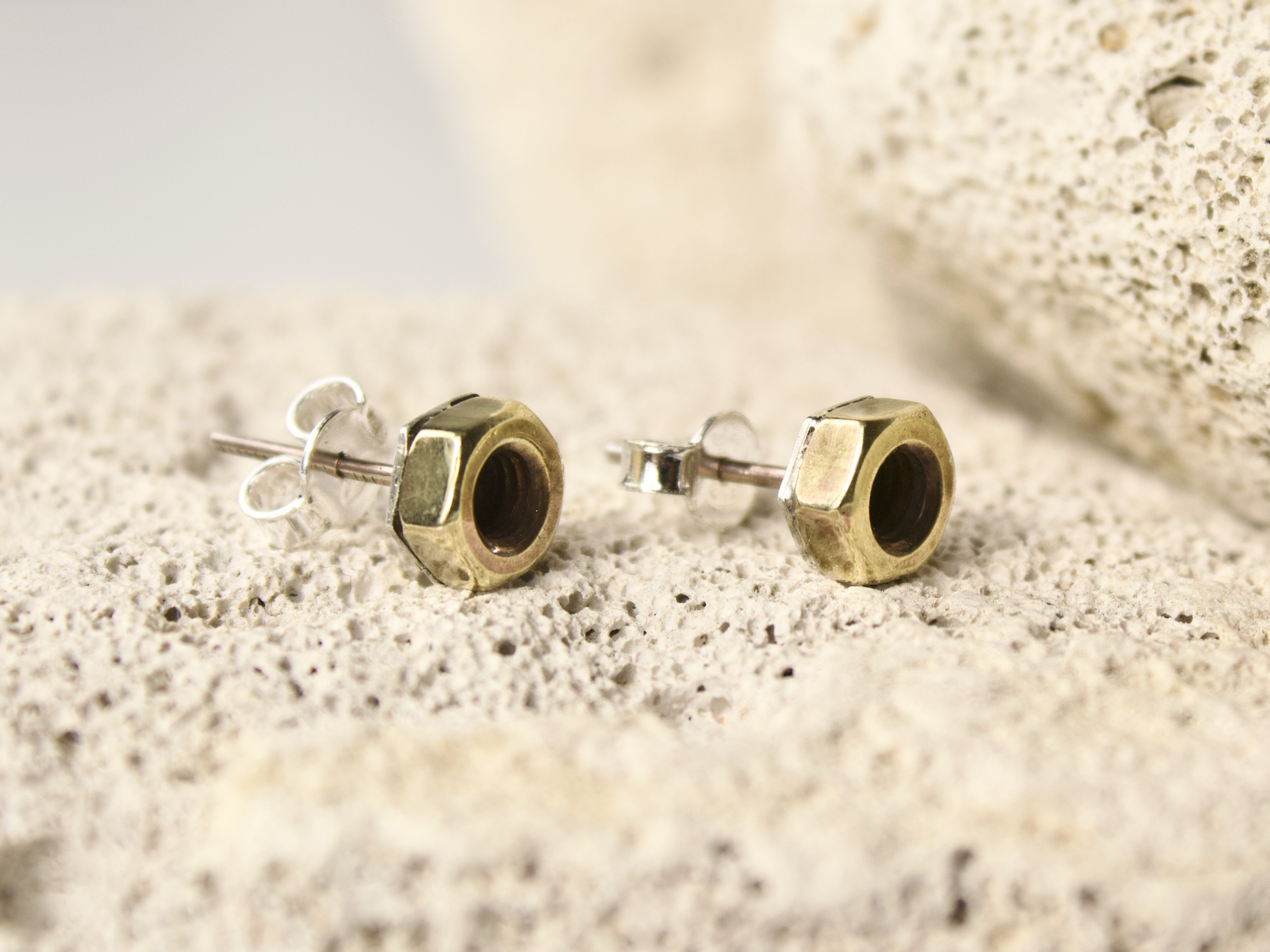 Questi orecchini sono realizzati con piccoli dadini in ottone. Di forma esagonale e di dimensione ridotte, hanno un design leggero e particolare. Il retro e i perni sono in argento.